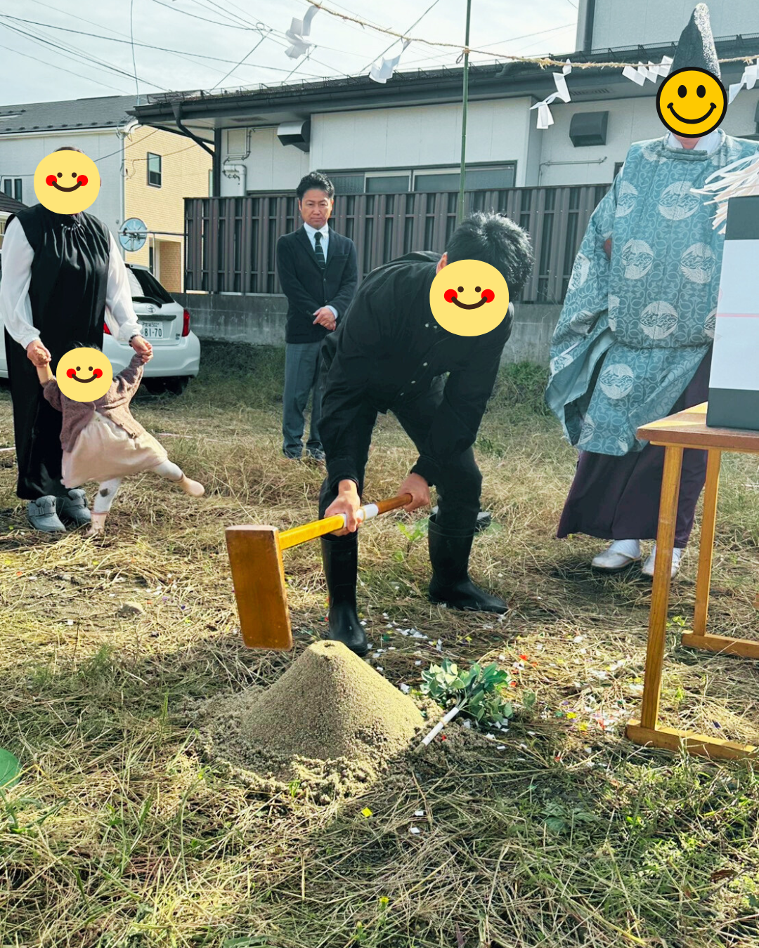 地鎮祭後の着工の挨拶周りでは、ニコニコ笑顔を振りまいてご近所さんを虜にしておりました♪